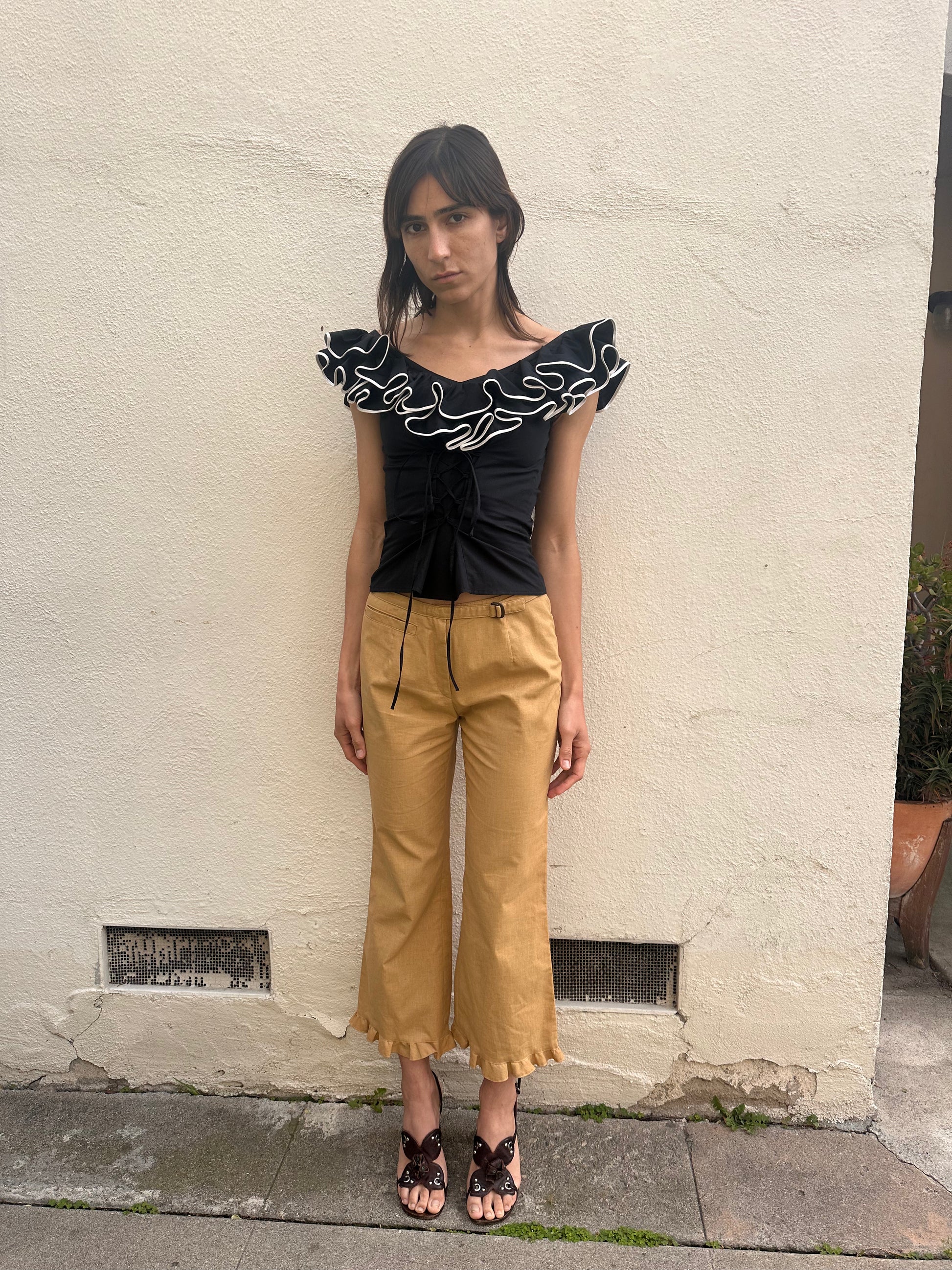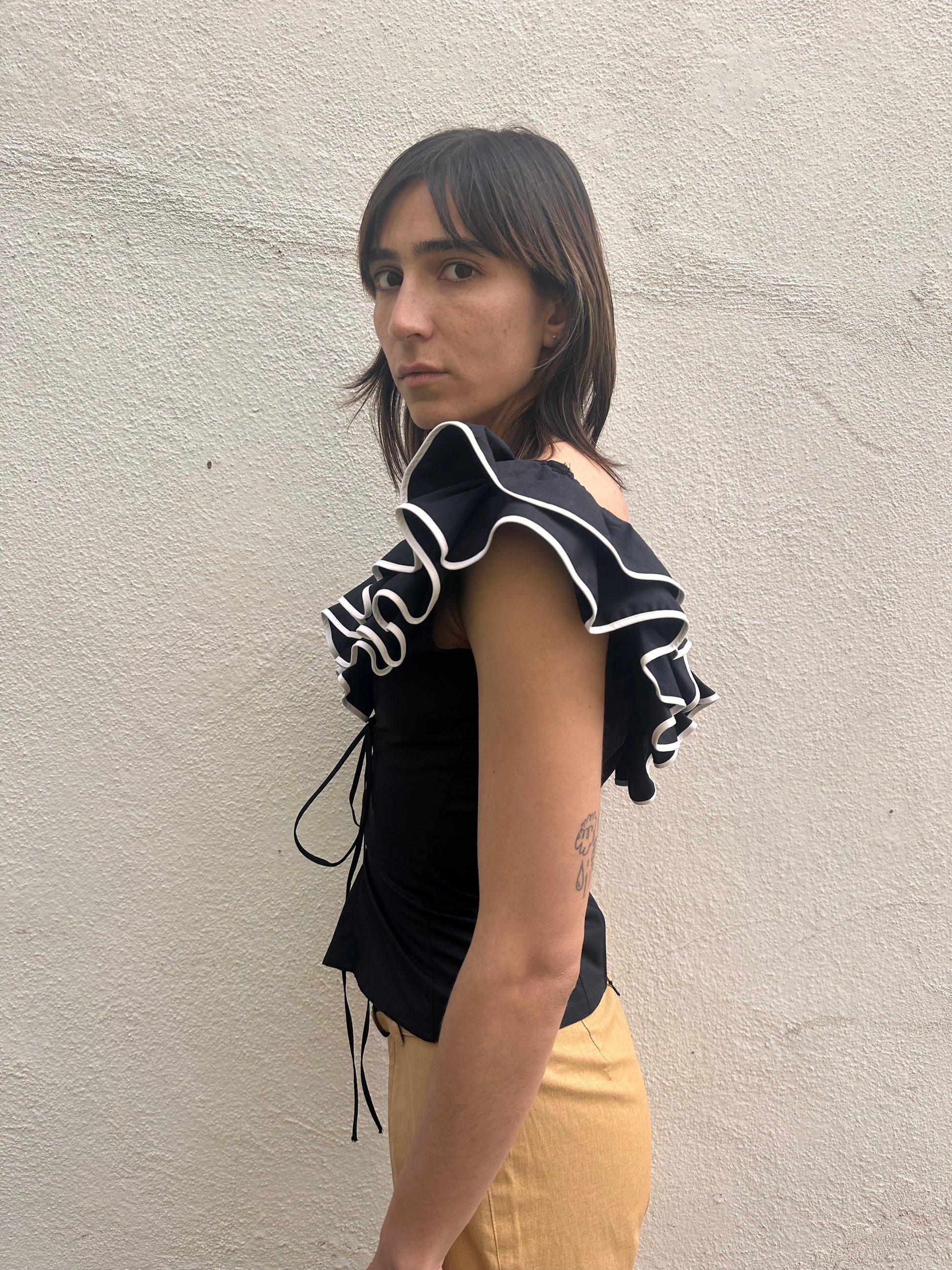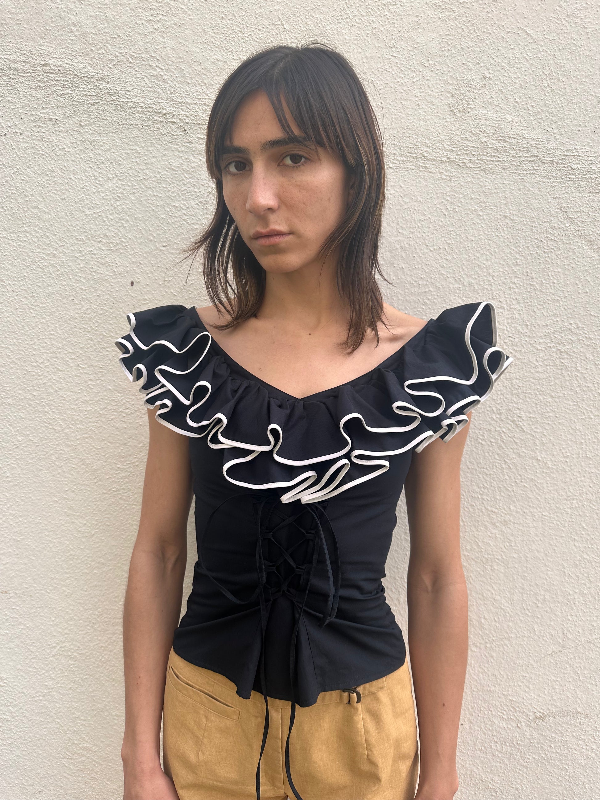 Black ruffled semi off the shoulder top with corset lace up detailing and zipper closure along the back.