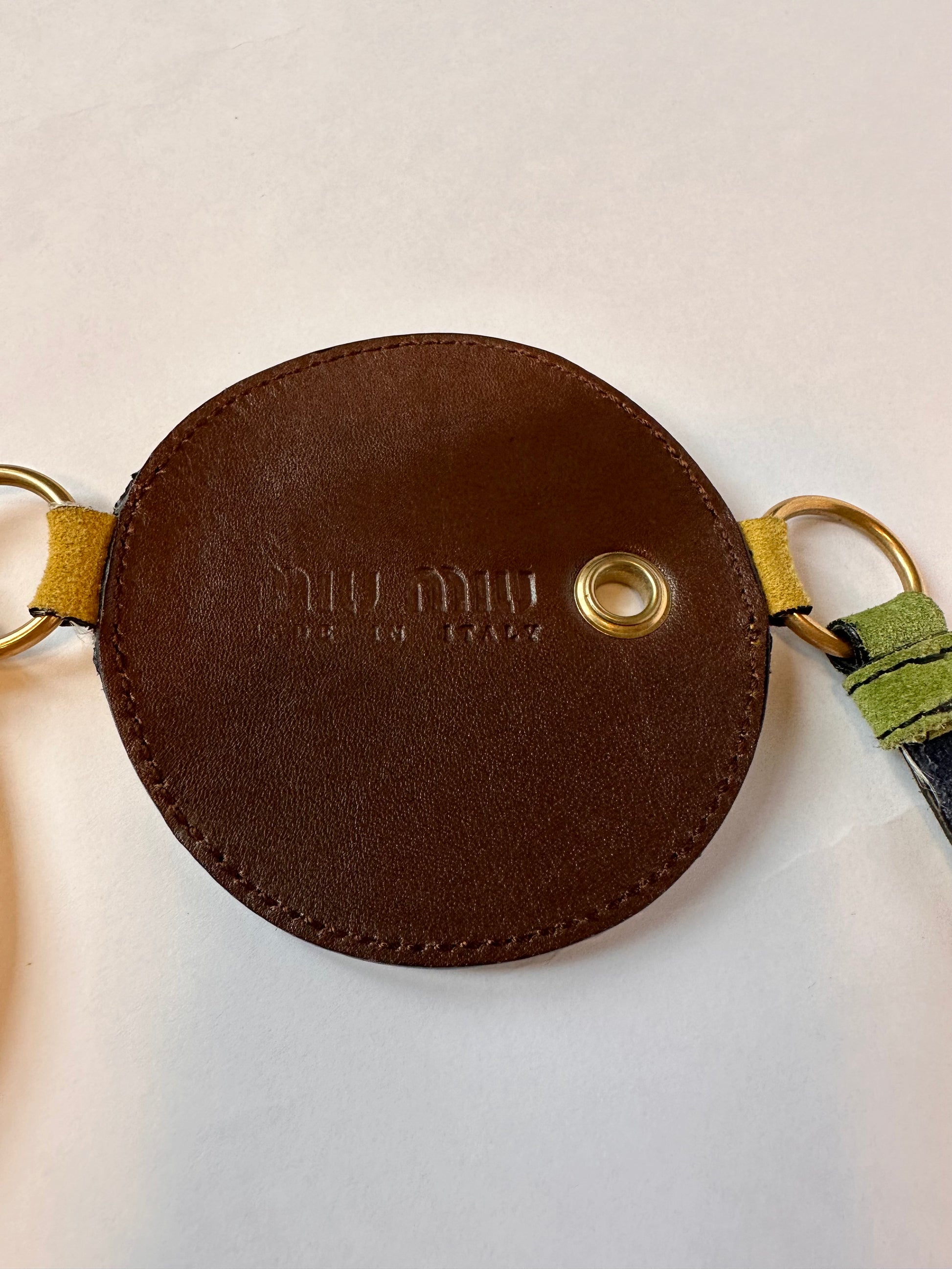 Spring 2005 Miu Miu runway suede belt, featuring a self-tie closure and chain-like interlinked yellow and green circle cut-outs