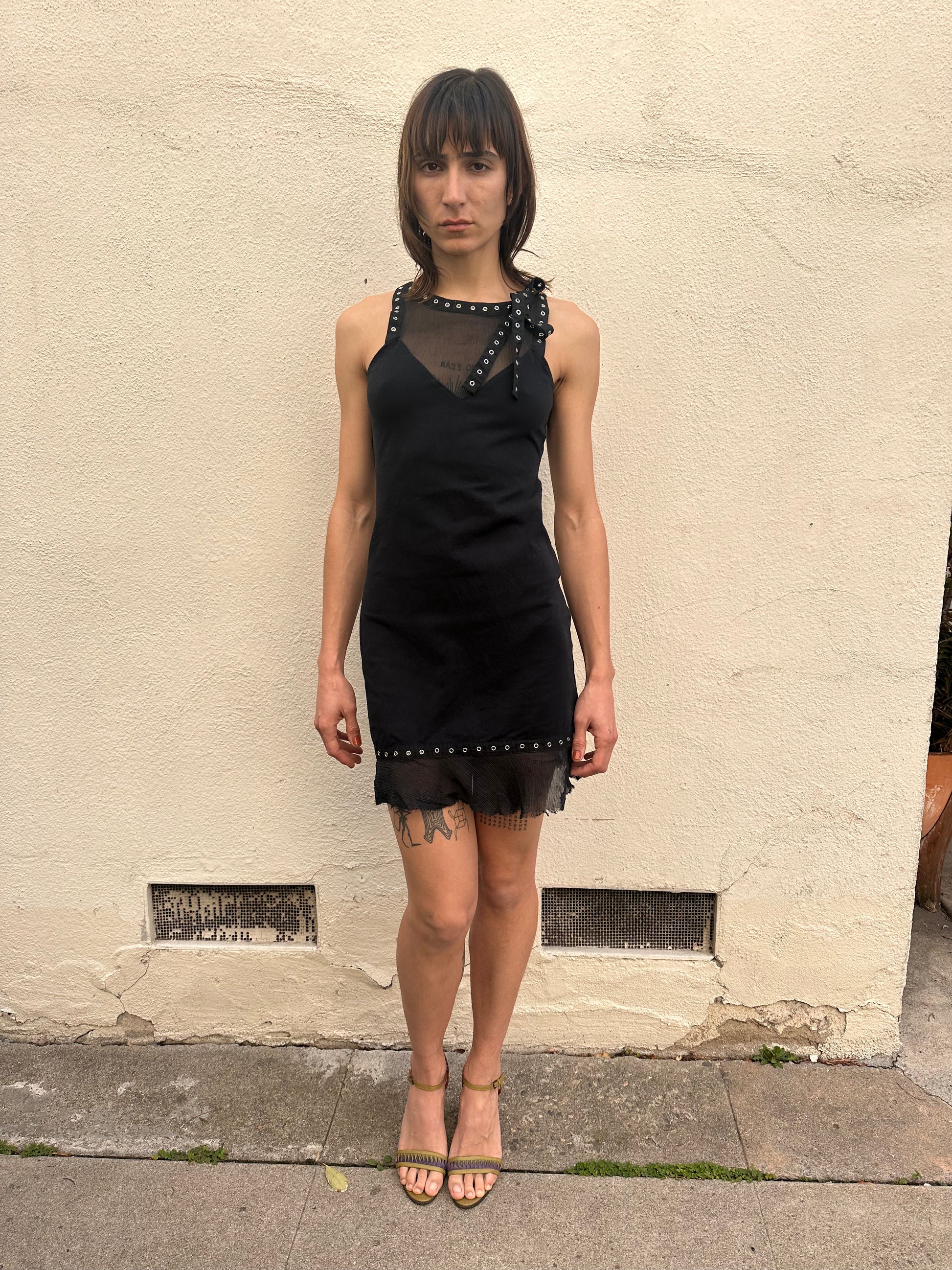 Mini black dress, featuring a cotton stretch body with a sheer collar and hem, and grommet trim. Includes self-tie straps at the side collar.