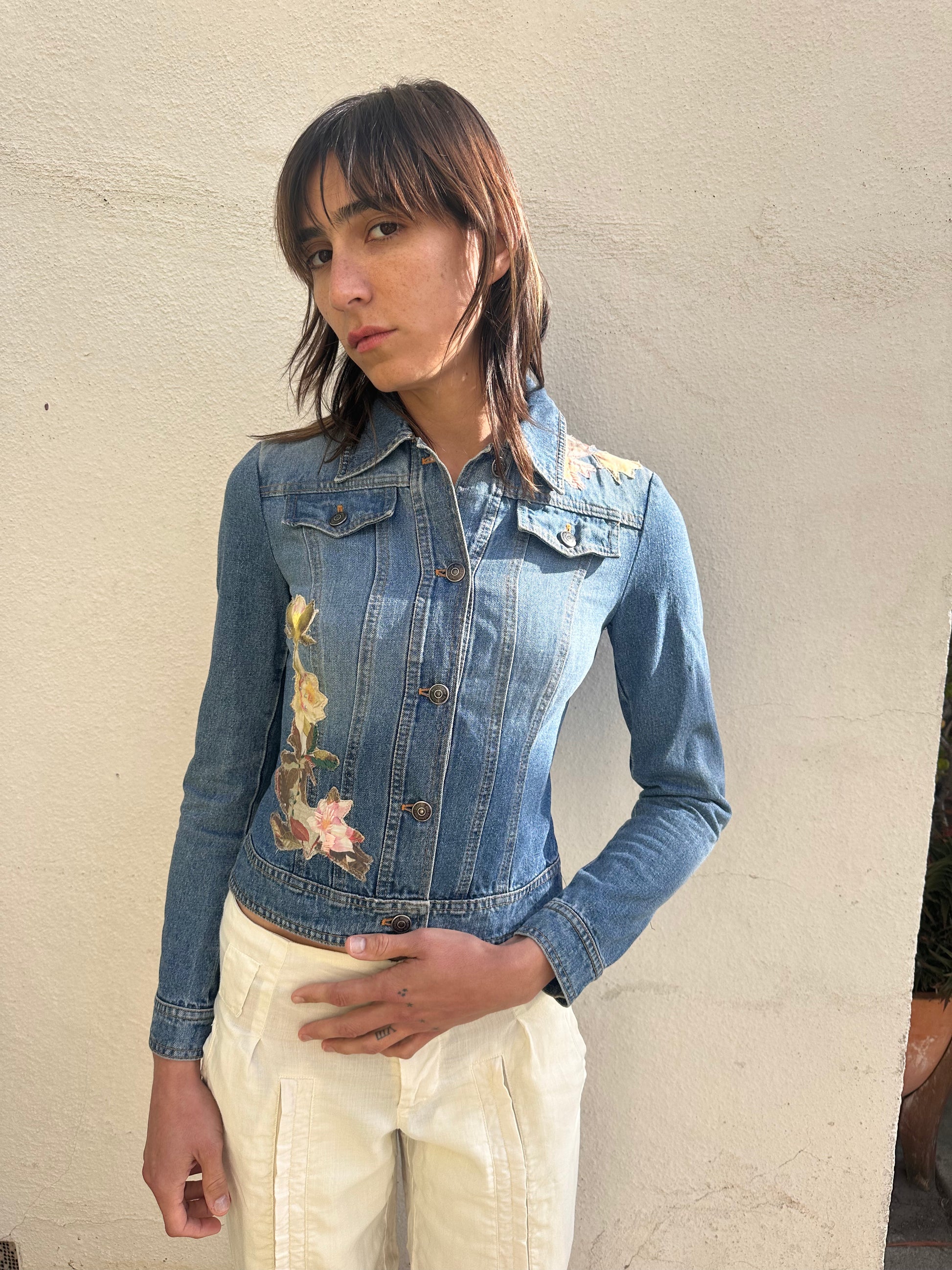 Mini denim jacket adorned with beautiful floral patchwork embroidery throughout.