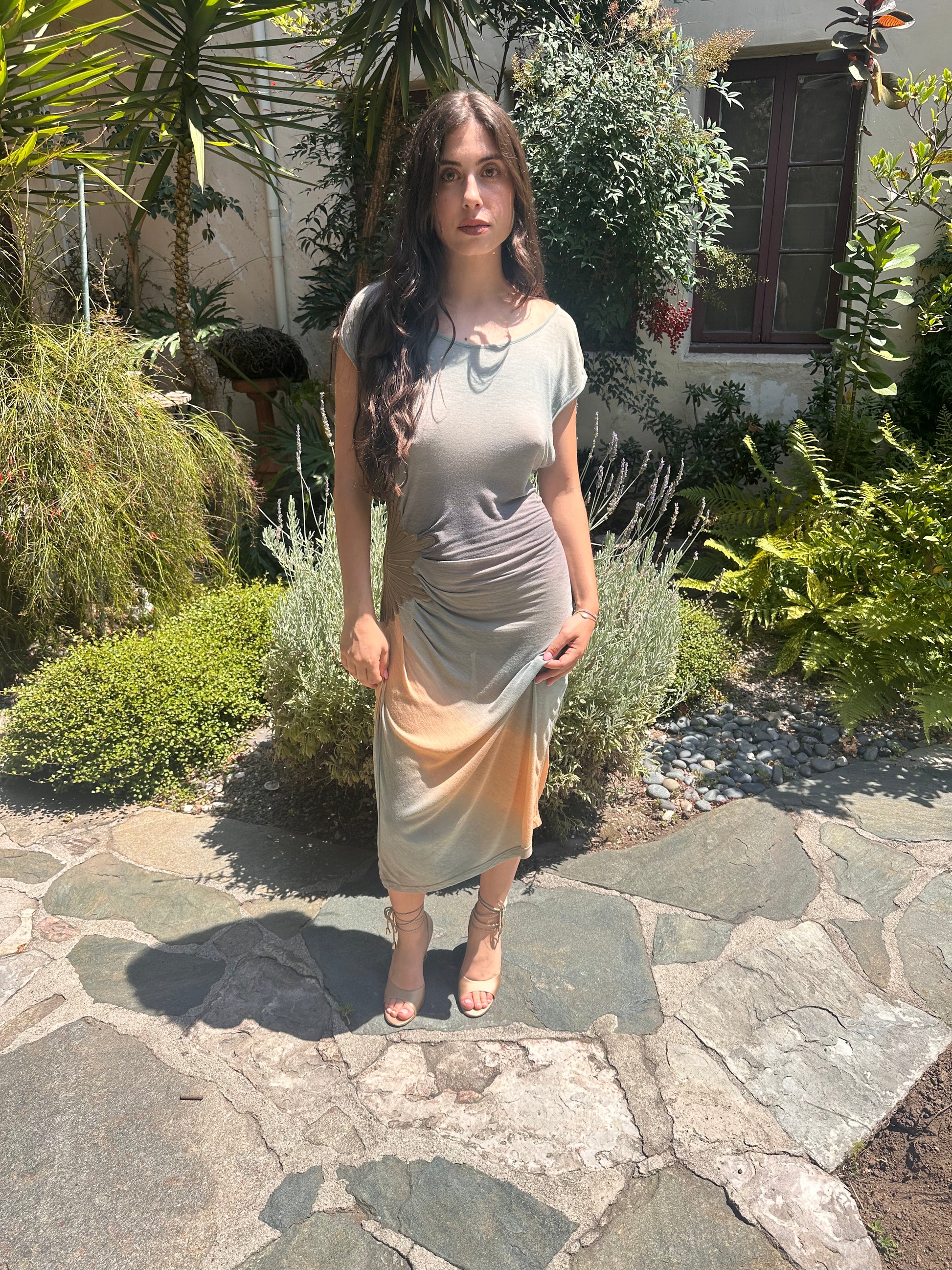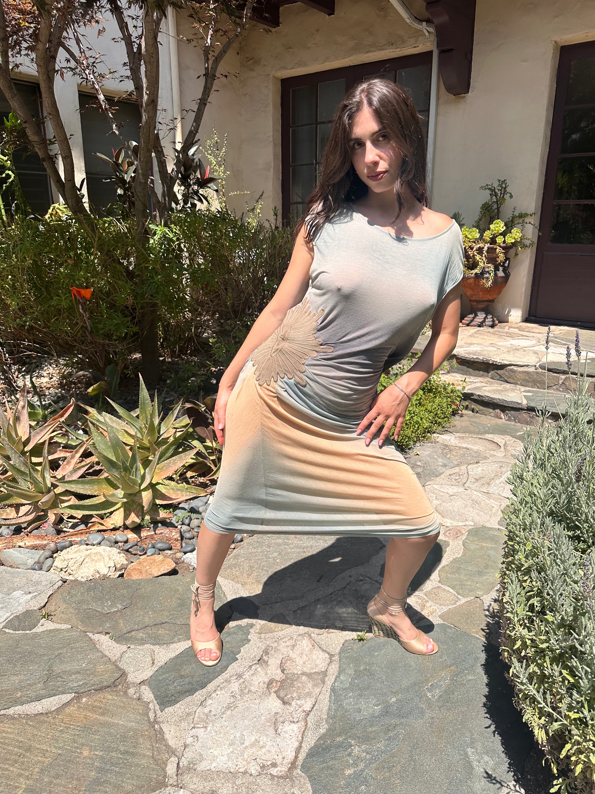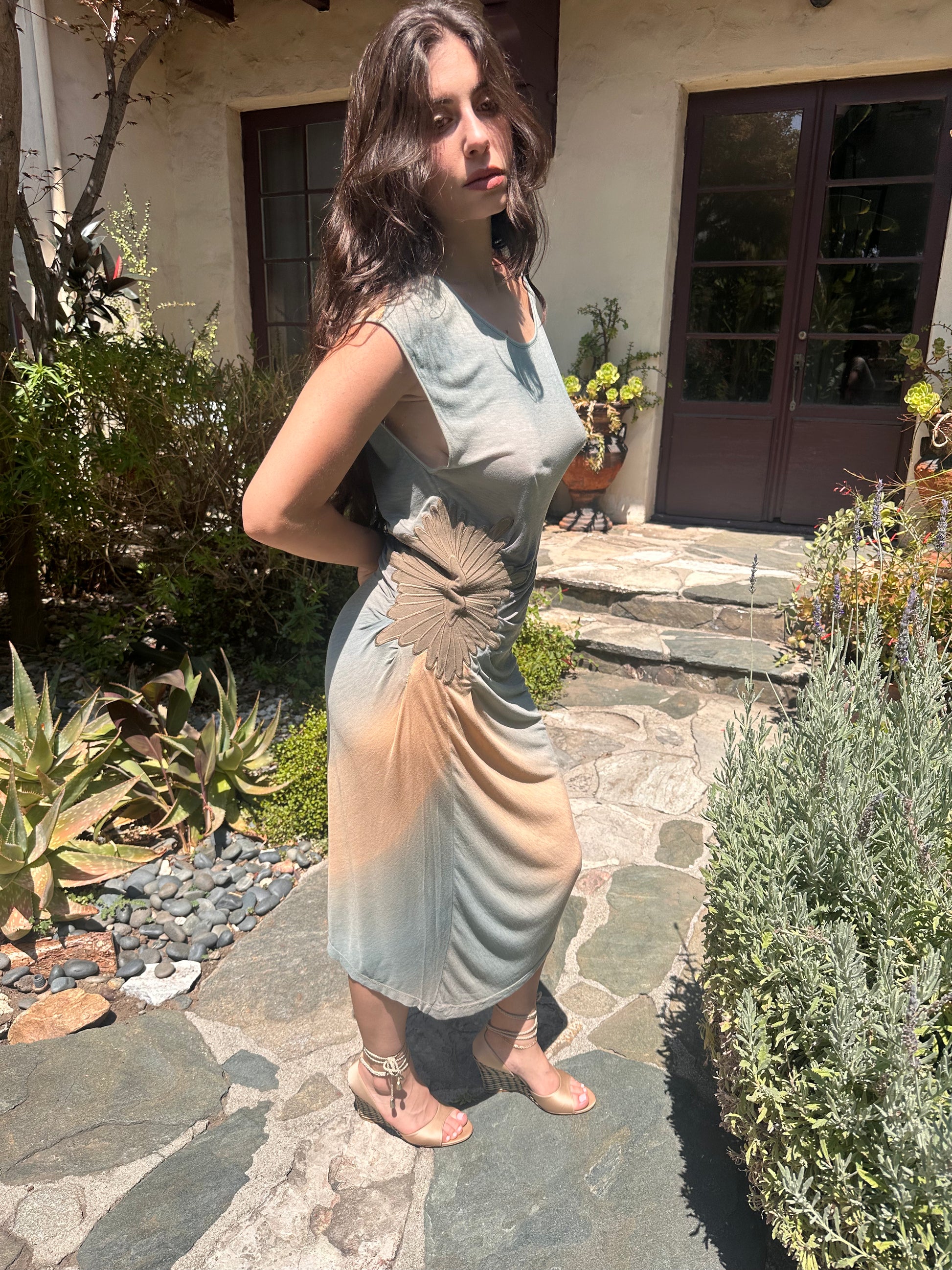 Dip-dyed stretch dress with gathered flower appliqué at the side