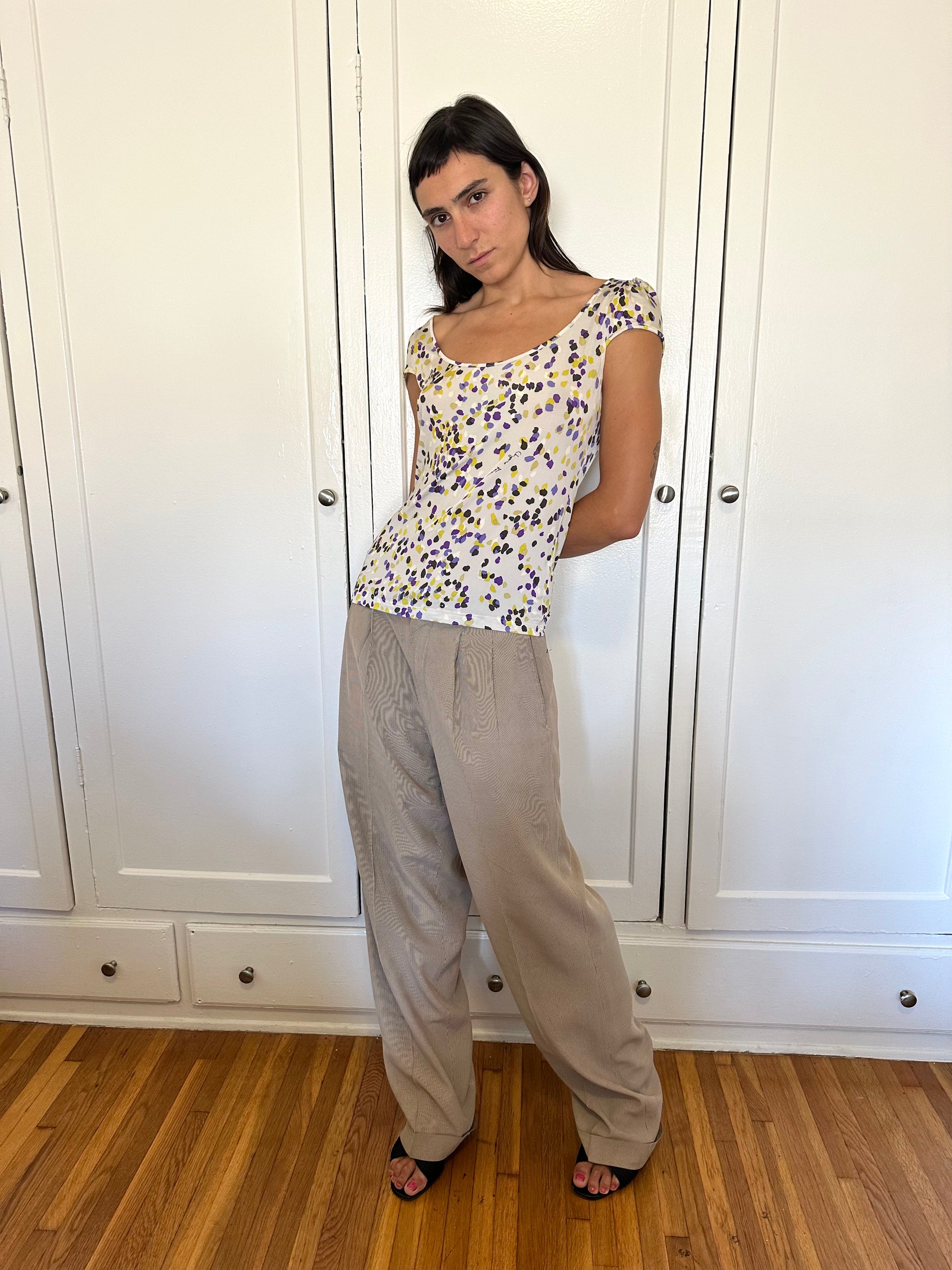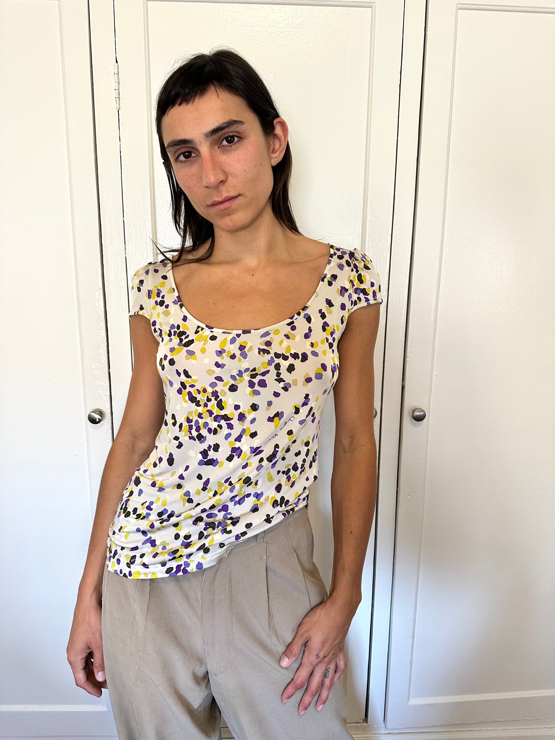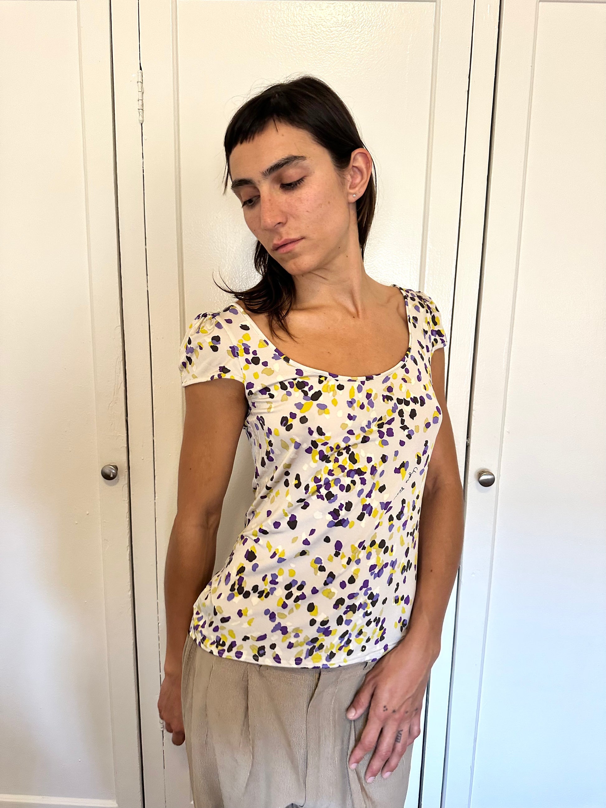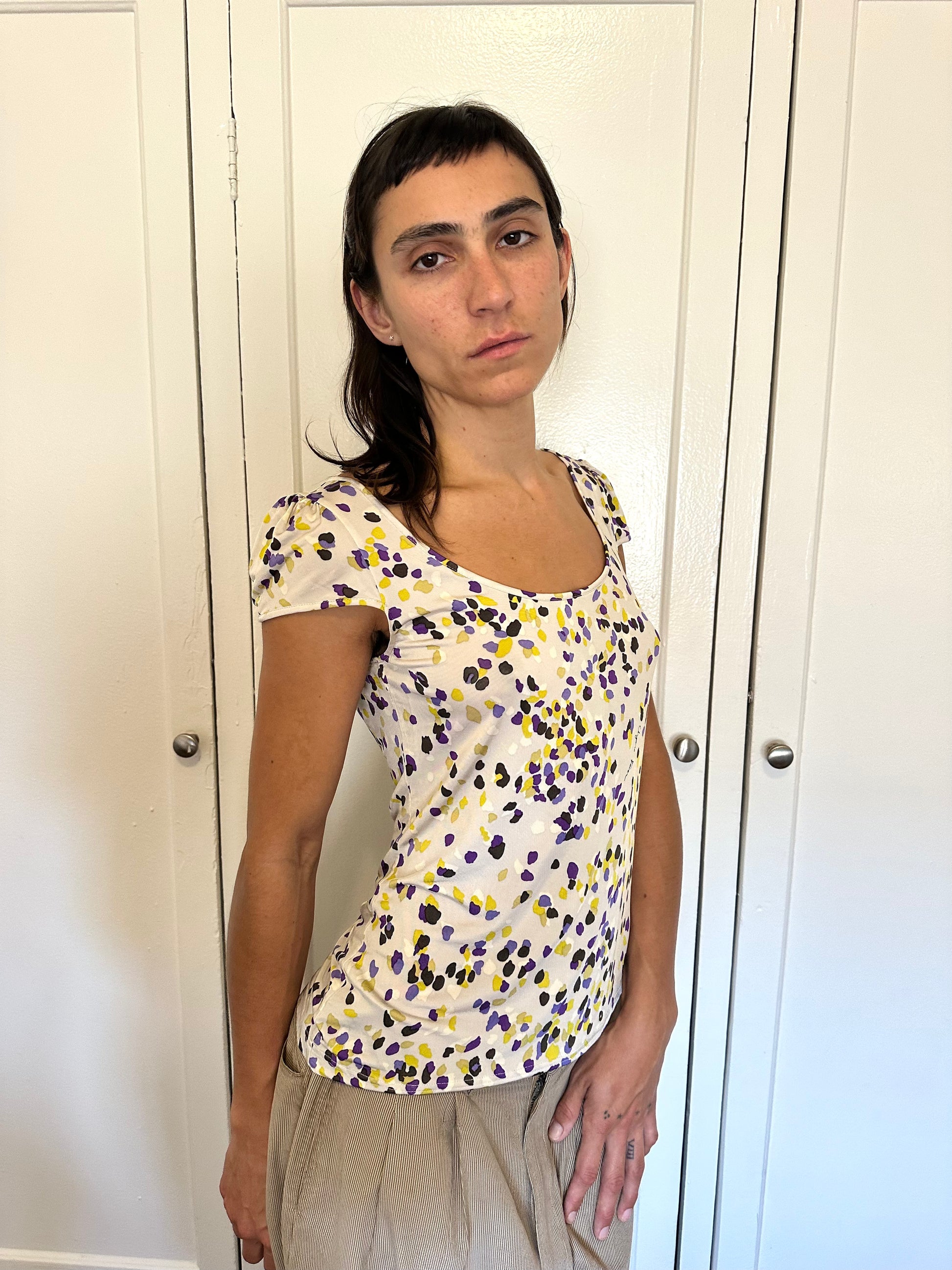 Short-sleeve t-shirt with a purple, lime, and black ink dot print.