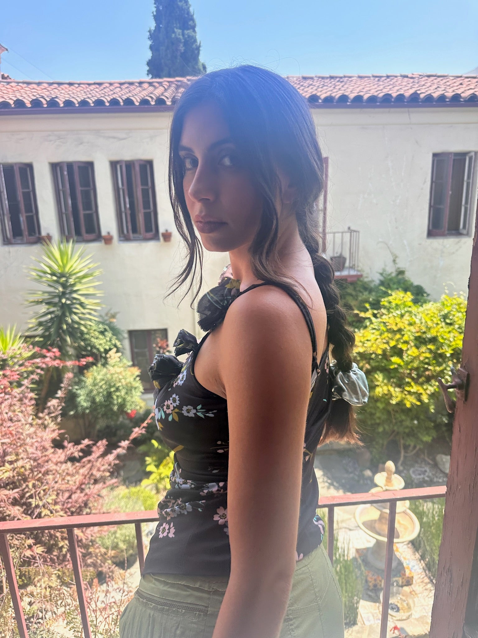 Dark brown floral printed tank top with rosette flowers along the neckline