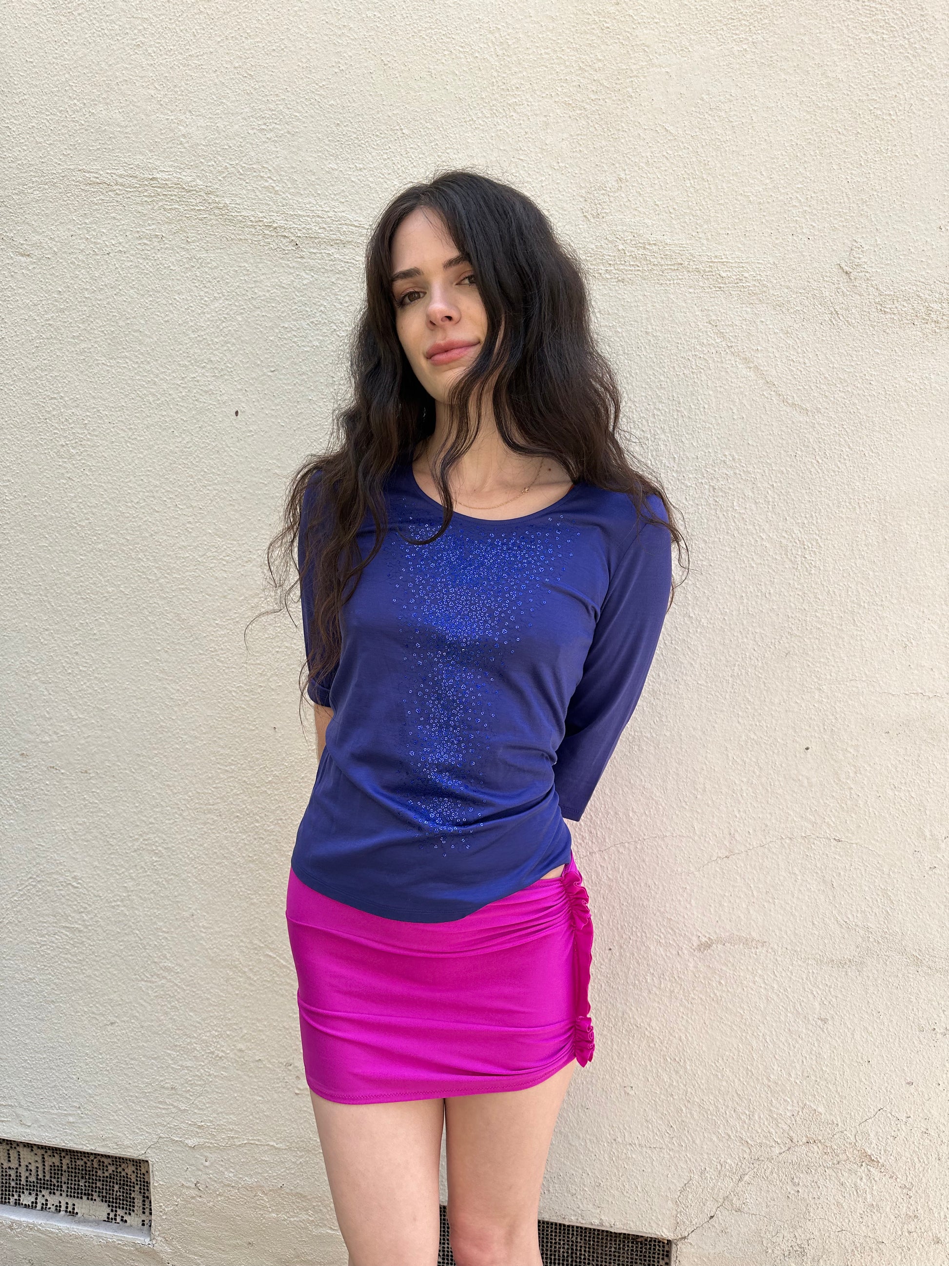 Long sleeve tee in purple indigo with front sequin detail and a slight flare at the hem. Simple with a touch of sparkle along the front.