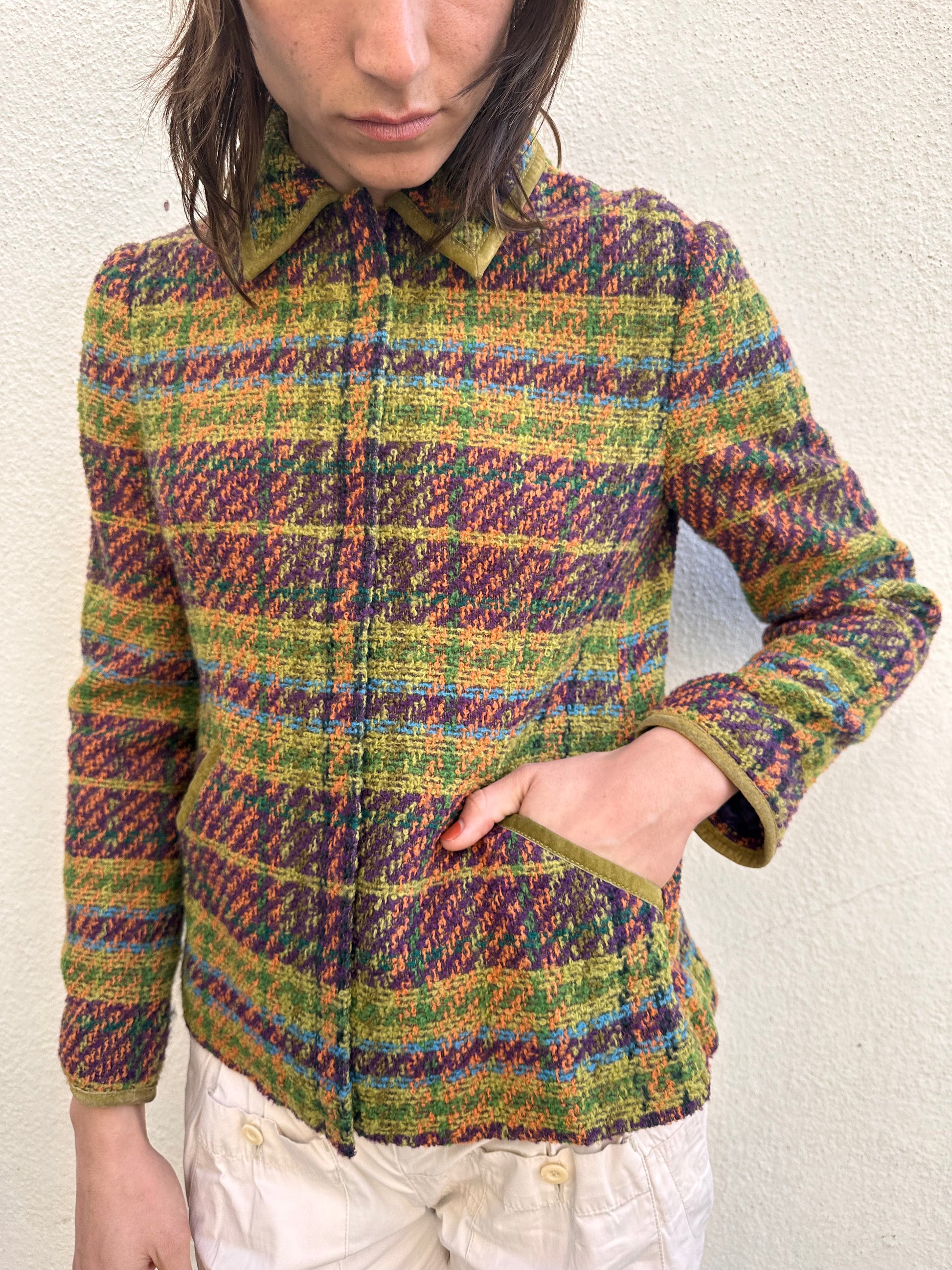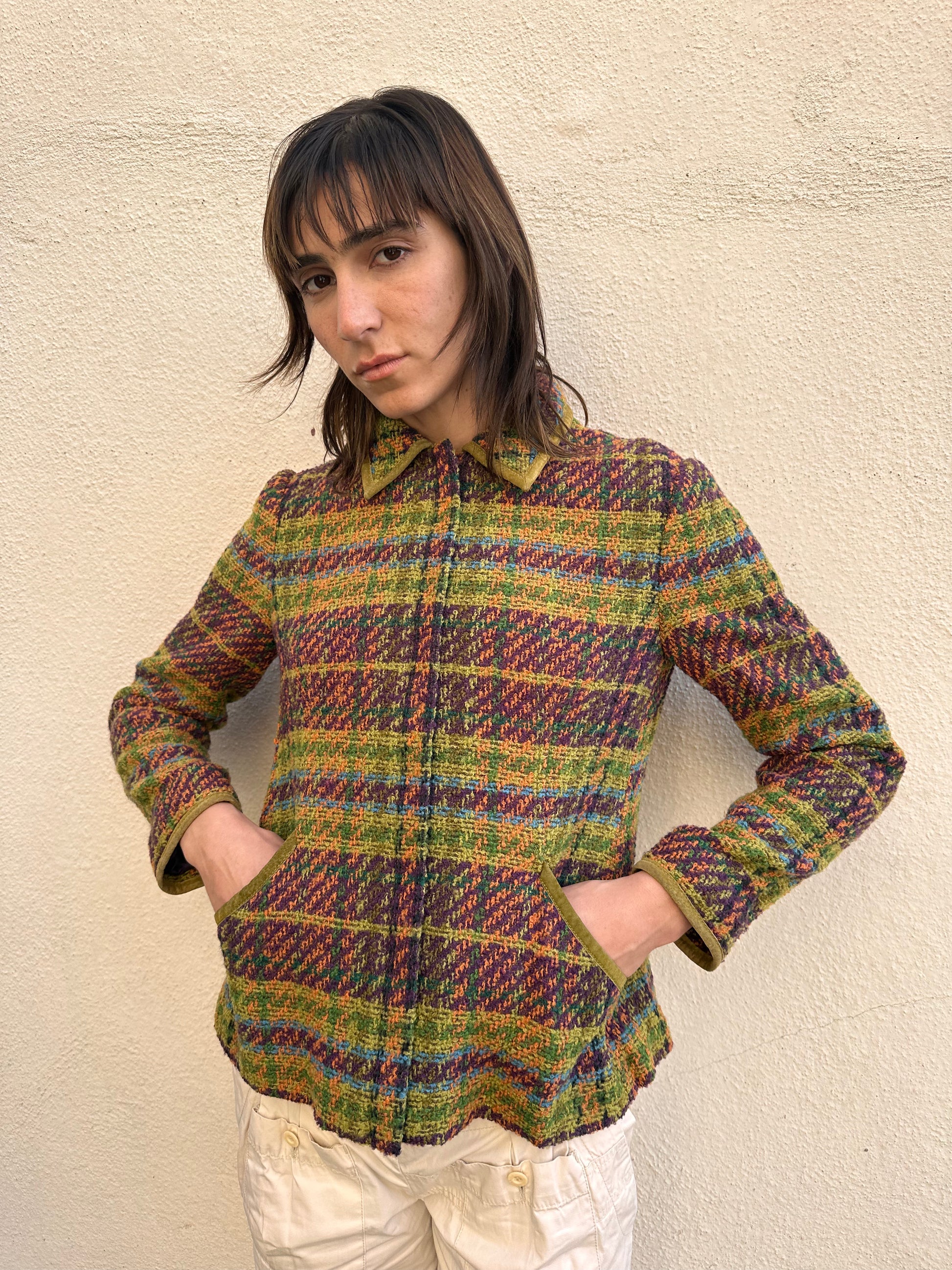 Green and purple zip-up plaid jacket with suede hem throughout.