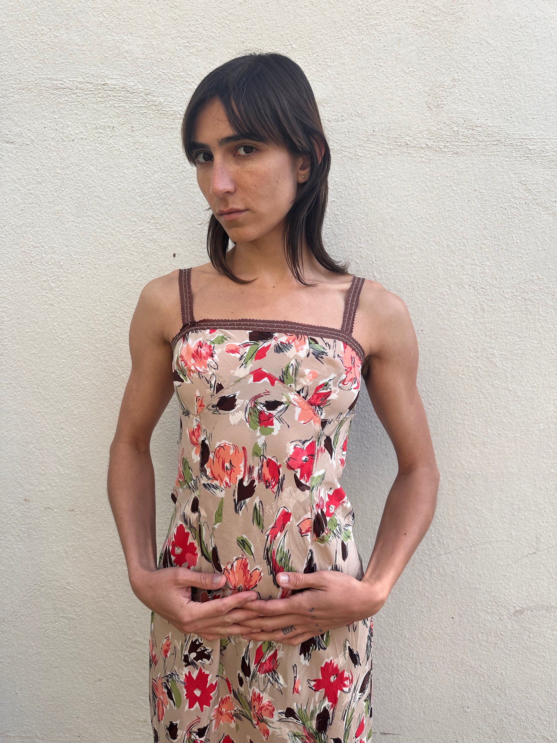 Sand-colored silk slip dress featuring a vibrant all-over floral illustration print. Designed with delicate spaghetti straps and detailed with brown serged stitching.