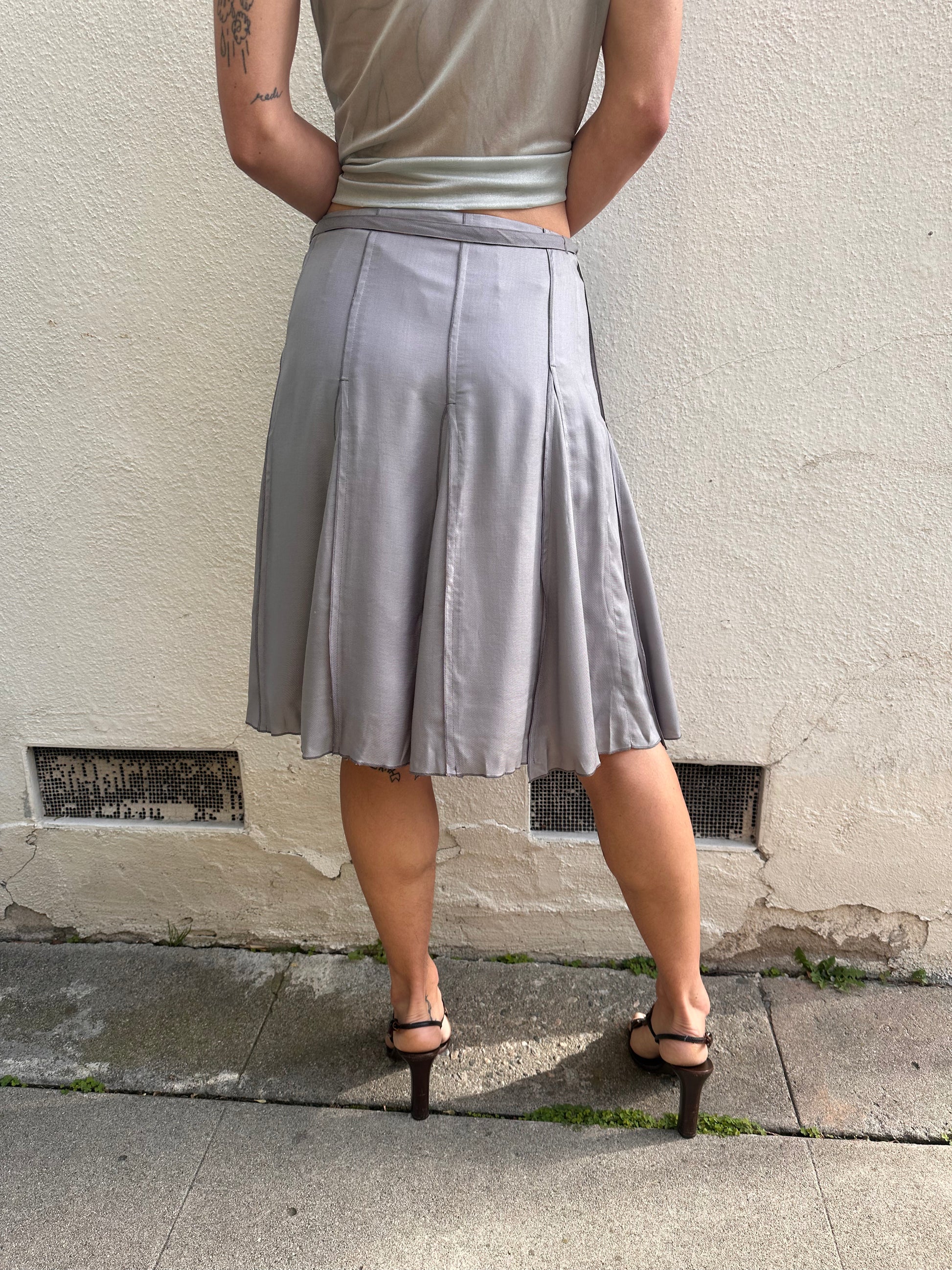 Sewn pleat grey flare skirt featuring a multicolored self-tie belt finished with a side zipper