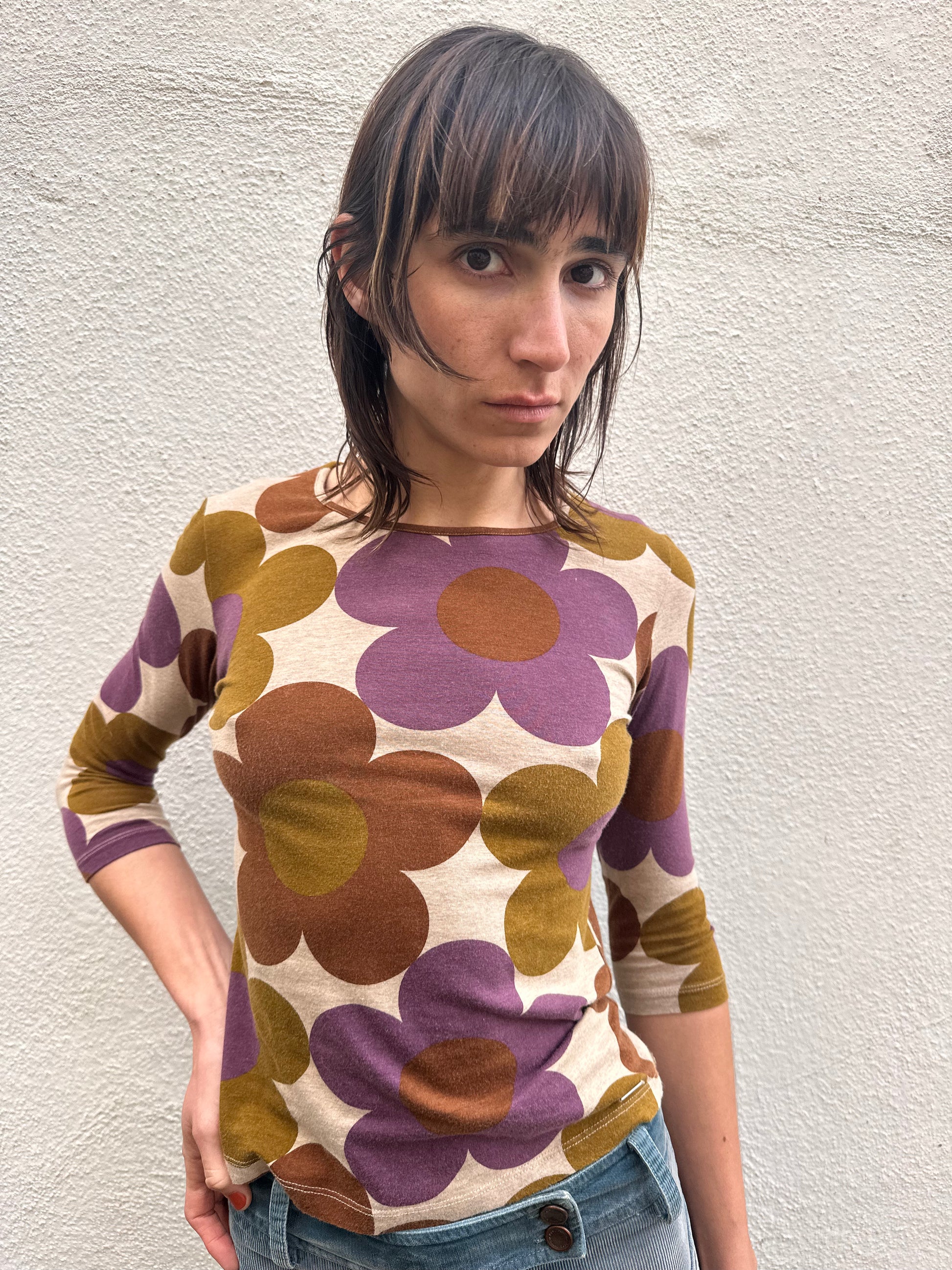 Spring 2002 flower print three-quarter sleeve t-shirt.