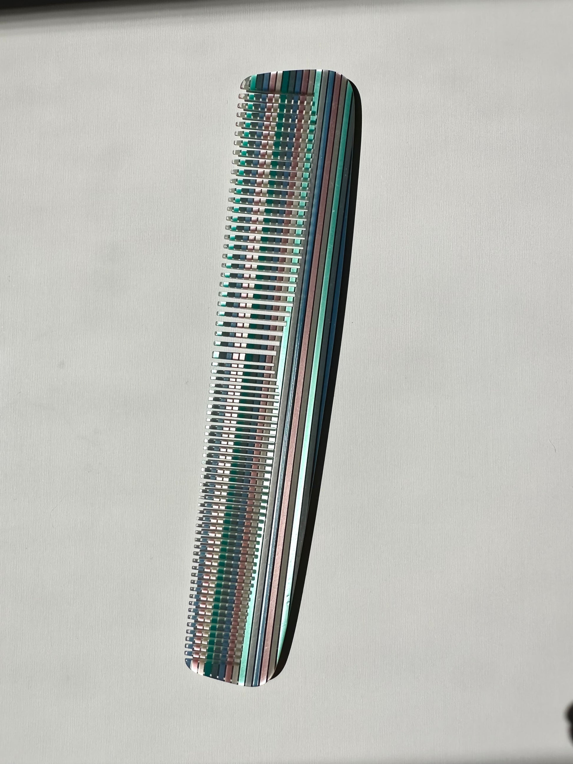 Deadstock vintage resin plastic, this fine-tooth comb features stripe pink, blue and green detailing. Ideal for smoothing flyaways and refining already-combed hair.