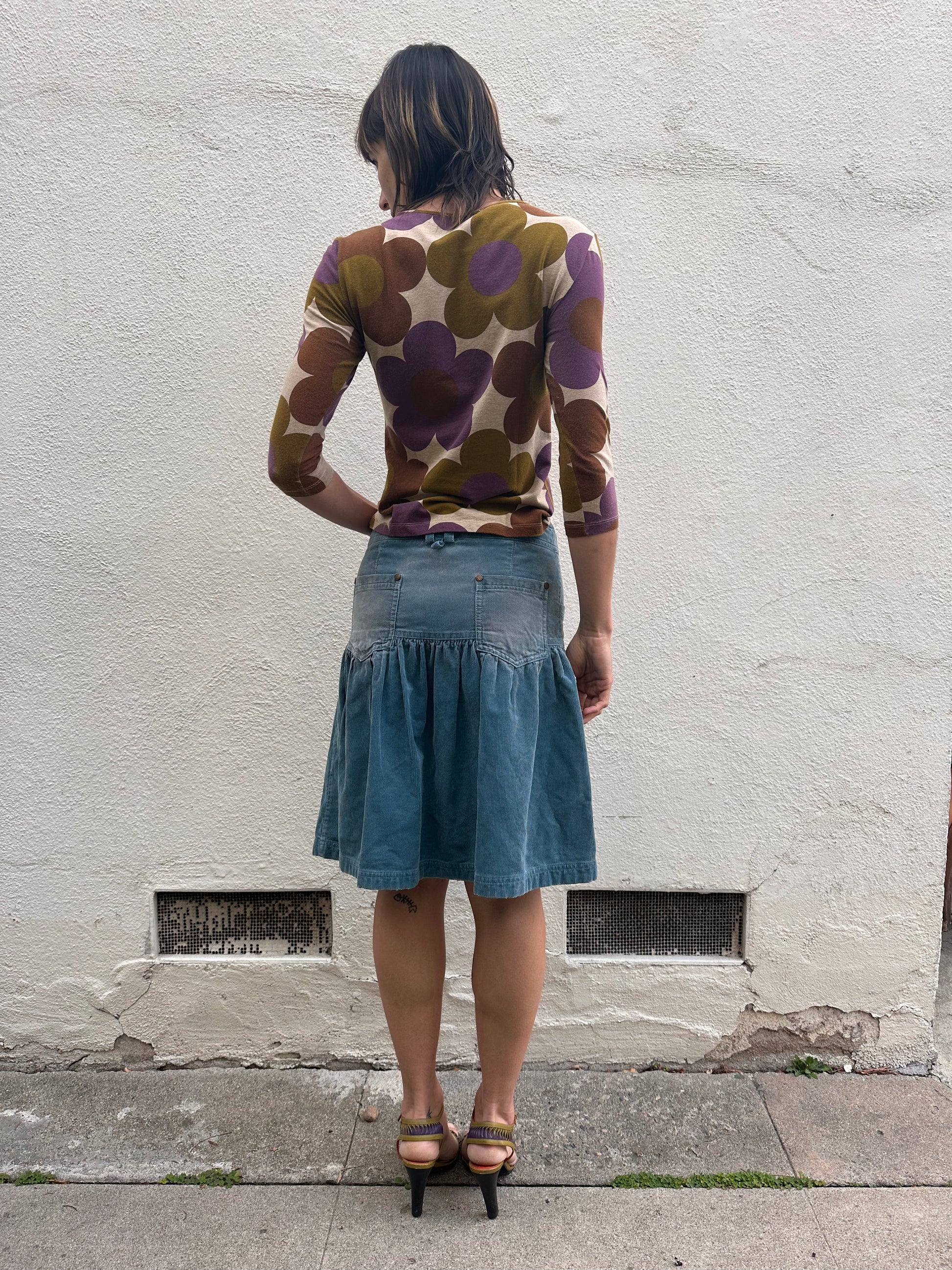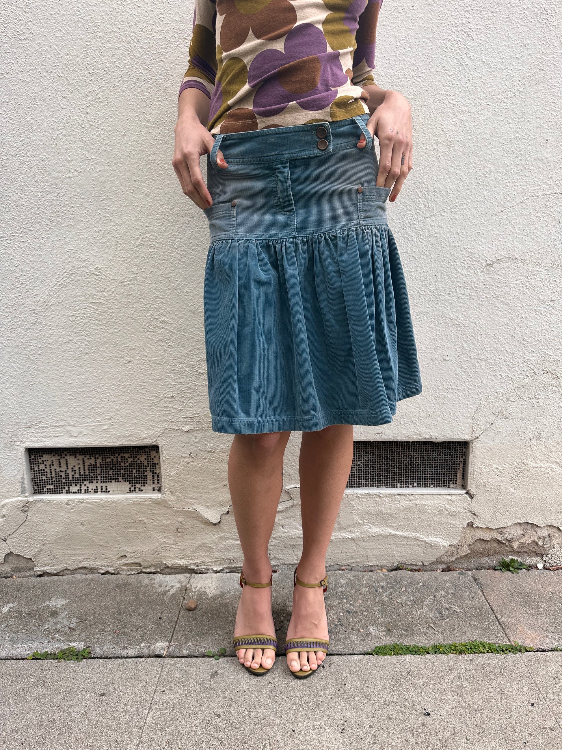 Teal corduroy skirt, flared design with a drop waist, featuring both front and back belt loops.